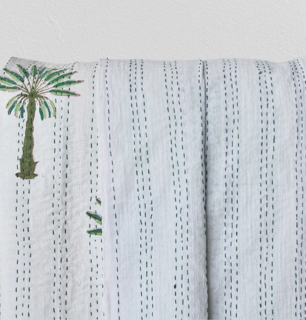 wrap around yourself while enjoying some drinks in your backyard or spread it over a bed for a tropical touch. It can be used both ways. Beautiful hand block printed palm design and Kantha hand embroidery on the front side. The plain white back with white and green Kantha embroidery.